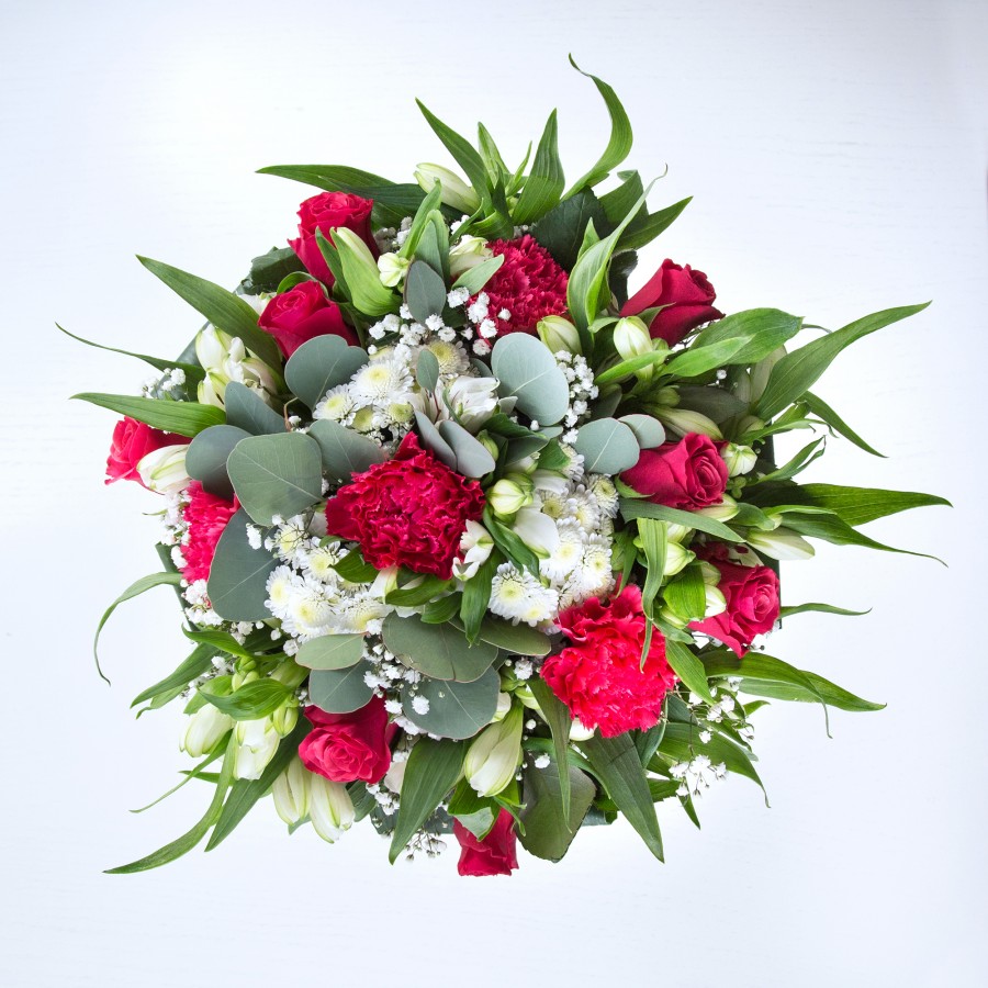 Embrace the elegant grace of our Elegant Grace Bouquet. This sophisticated arrangement features white chrysanthemums and gypsophila combined with stunning red roses and delicate carnations, artfully arranged with white alstroemeria and aspidistra leaves.